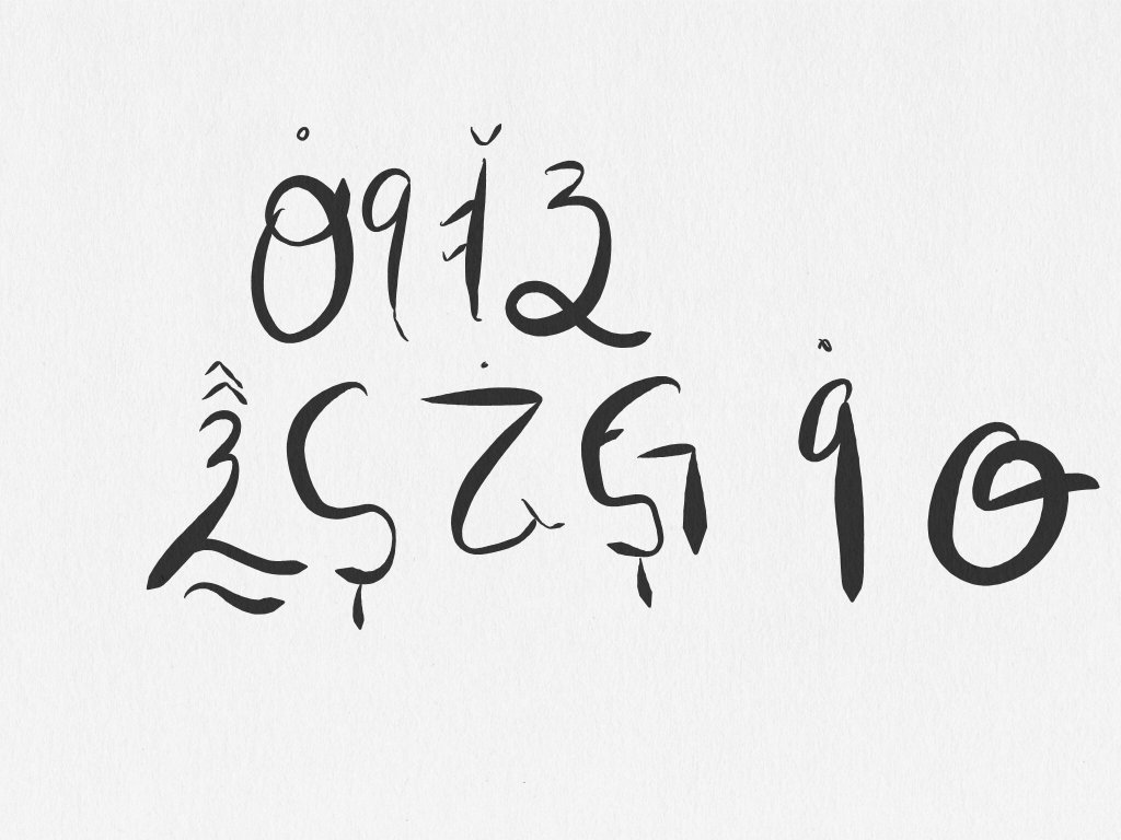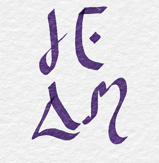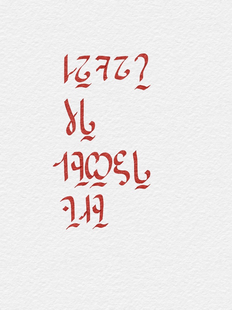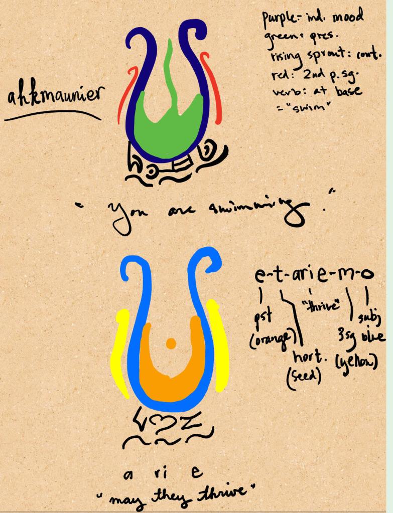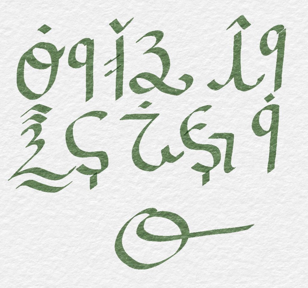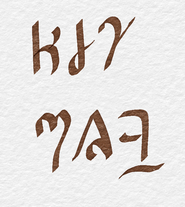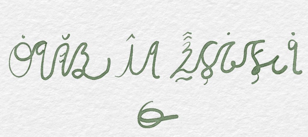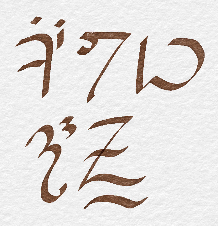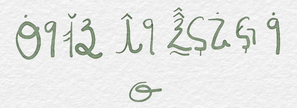 As you can see, many letters are modified to represent the numerous additional sounds that Karkin has. Some consonants have added marks to indicate that voicing (Seloi doesn’t have voiced stops like b, d, g, for example). Some letters have descender marks below them to indicate a change in place of articulation (usually farther back in the mouth). Some fricatives (like the letters for v and s) are reversed to show a change in voicing (f and z). The letter for /l/ is modified to represent /r/ and /ʎ/. Various other changes show sounds that don’t exist in Seloi. Long vowel are represented by double diacritics.